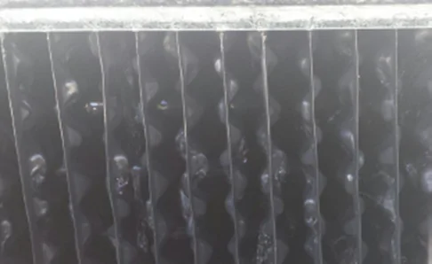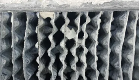 Cooling tower fill with major scaling issues before CL5660 cleaner was appliedCooling tower fill free of scale after CL5660 cleaning