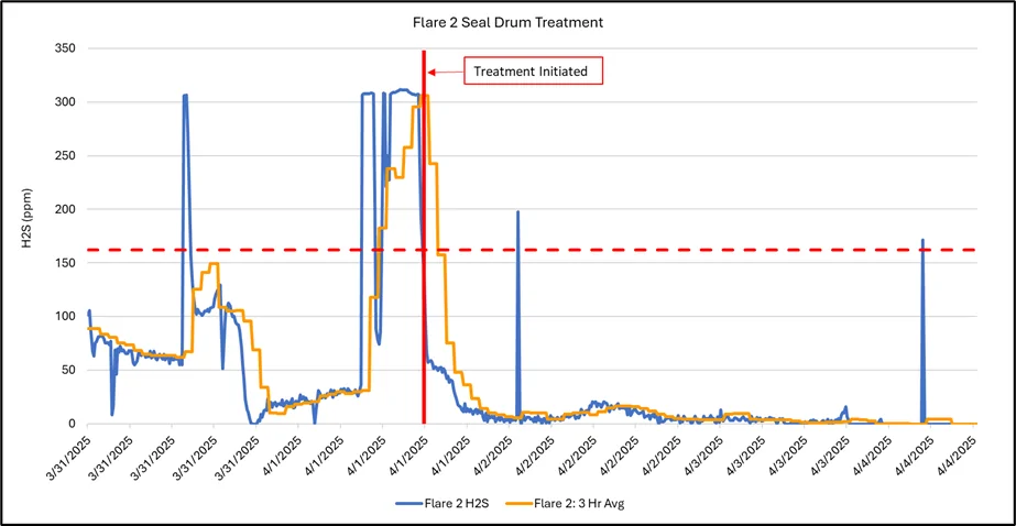 When the second flare system was brought back on-line, operators again struggled to meet permit limits. CT9156 was applied to this seal drum as well, and H2S levels were reduced to well below the three-hour 162 ppm limit.