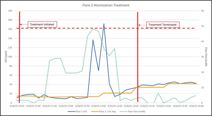 After the program was developed, the refinery took the FGRU off-line for a live flare job. To test the new injection system, the scavenger was proactively atomized into the flare line to reduce the potential for environmental permit exceedance.