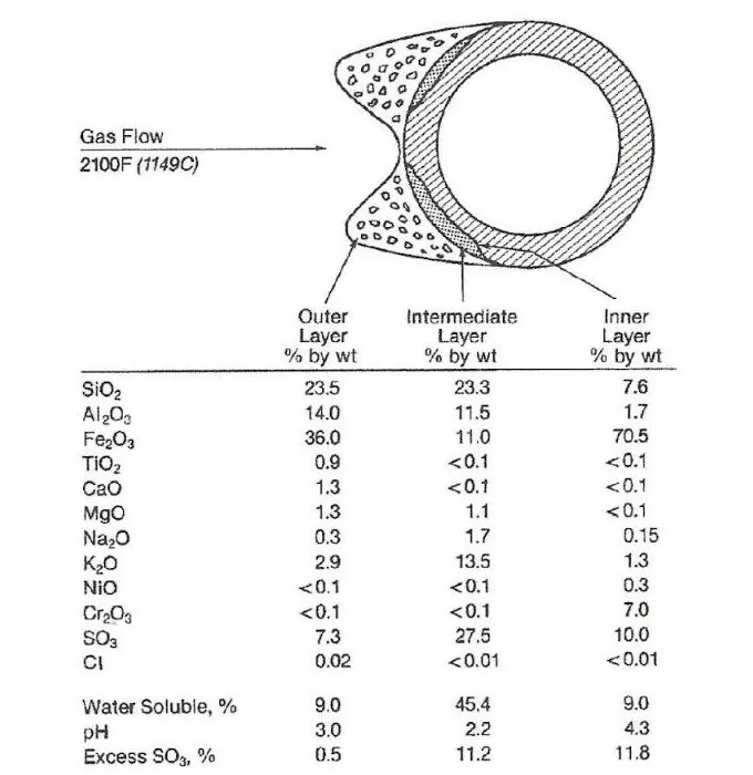 The accumulation of ash deposits in the convective pass can also have adverse effects from a corrosion perspective. As ash deposits build up, volatile alkalis and sulfur trioxide (SO3) produced during combustion diffuse through the ash to initiate corrosion reactions. Figure 5.4 illustrates one example of the morphology of a coal ash corrosion deposit.