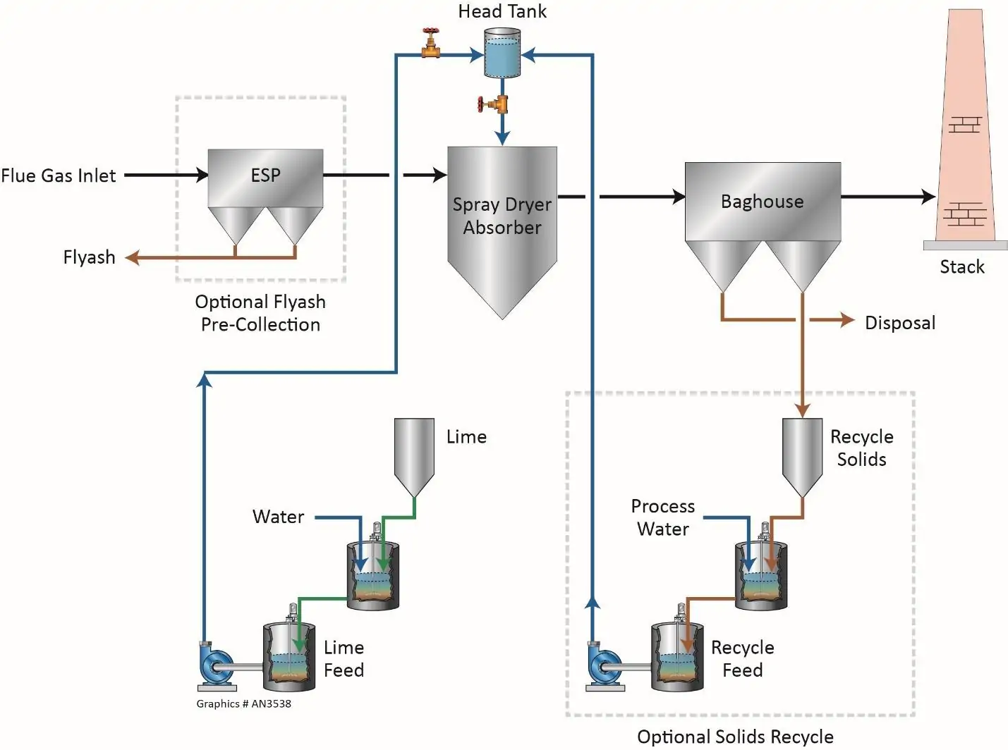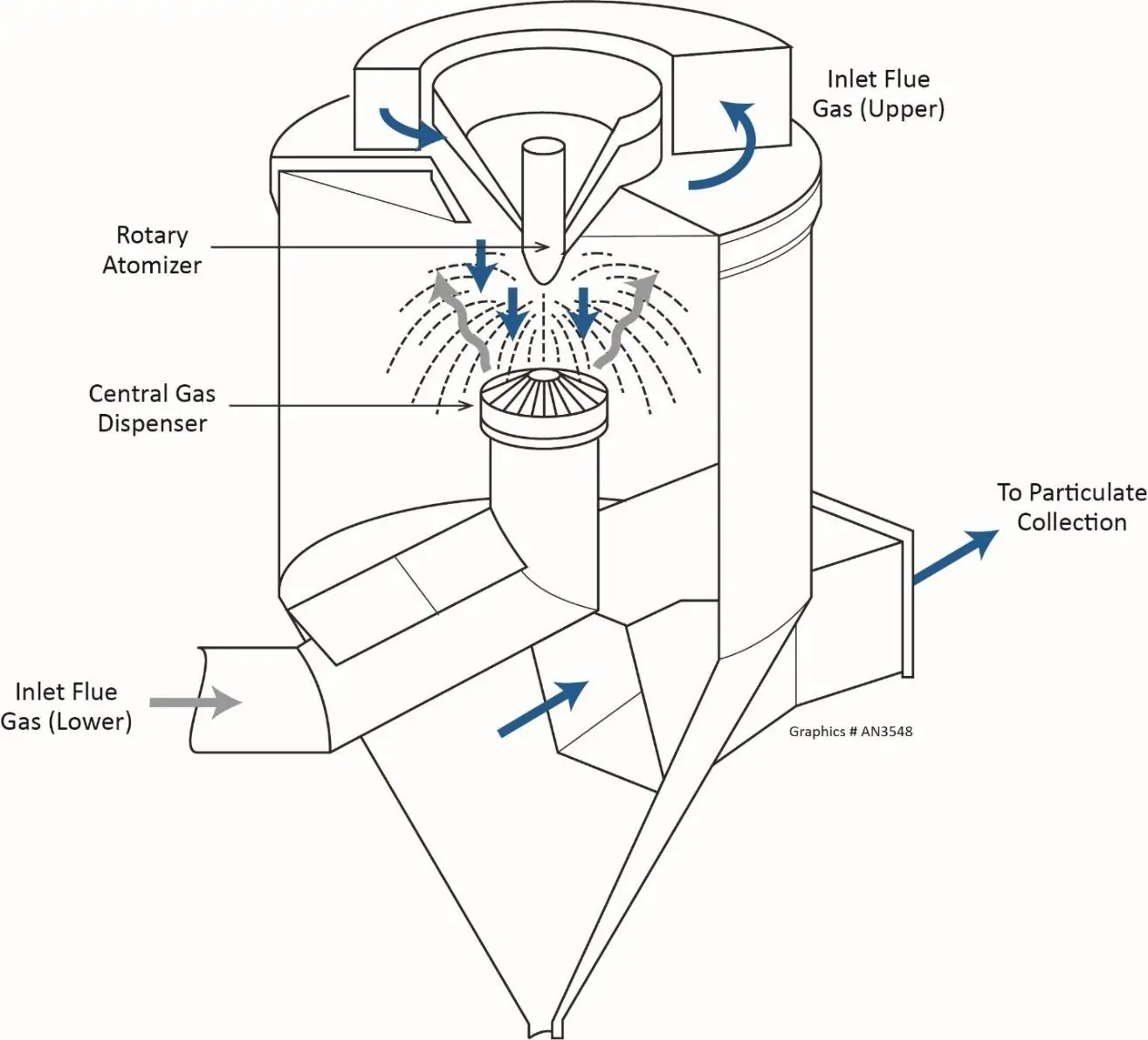 The key components include the lime slaker, the absorber with atomizers that convert the lime slurry into uniformly spread small droplets at the emission point, and the particulate collector, typically a fabric filter device. Providing droplets that have enough moisture to absorb SO2 from the flue gas and complete the required reaction with lime, but that also will dry in the heat of the flue gas such that completely dry solid particles arrive at the particulate collector is vital to this process.