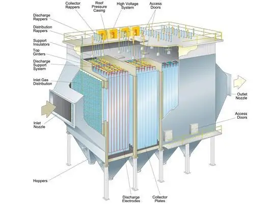 The bags are mounted on wire frames within the vessel. Flue gas enters from the side, is deflected by, and flows around a baffle plate, then passes through the bags. Fly ash remains on the exterior of the bags as the flue gas exits the top of the vessel. Periodically, a jet of air is blown through the bags to dislodge the ash, which falls to hoppers below. Baghouses typically feature several compartments, each containing rows of filters.