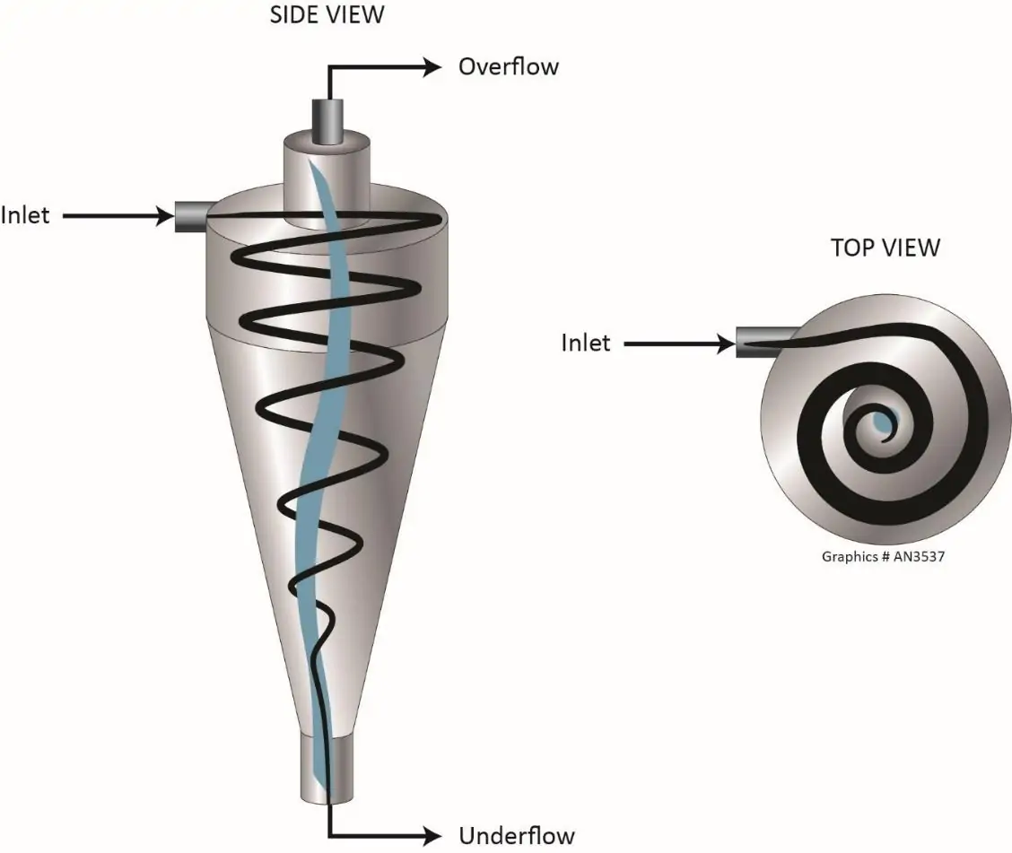 Limestone slurry enters these stationary devices in a tangential opening near the top. The design imparts a centripetal action to the slurry, forcing lighter and more reactive limestone particles through the overflow to the scrubber, while heavier particles exit through the underflow and are routed back to the ball mills. Hydrocyclones are equipped with vortex finders, similar to orifice plates, on the overflow and underflow lines. This design allows for simple filter changes to adjust the particle size exiting each port.