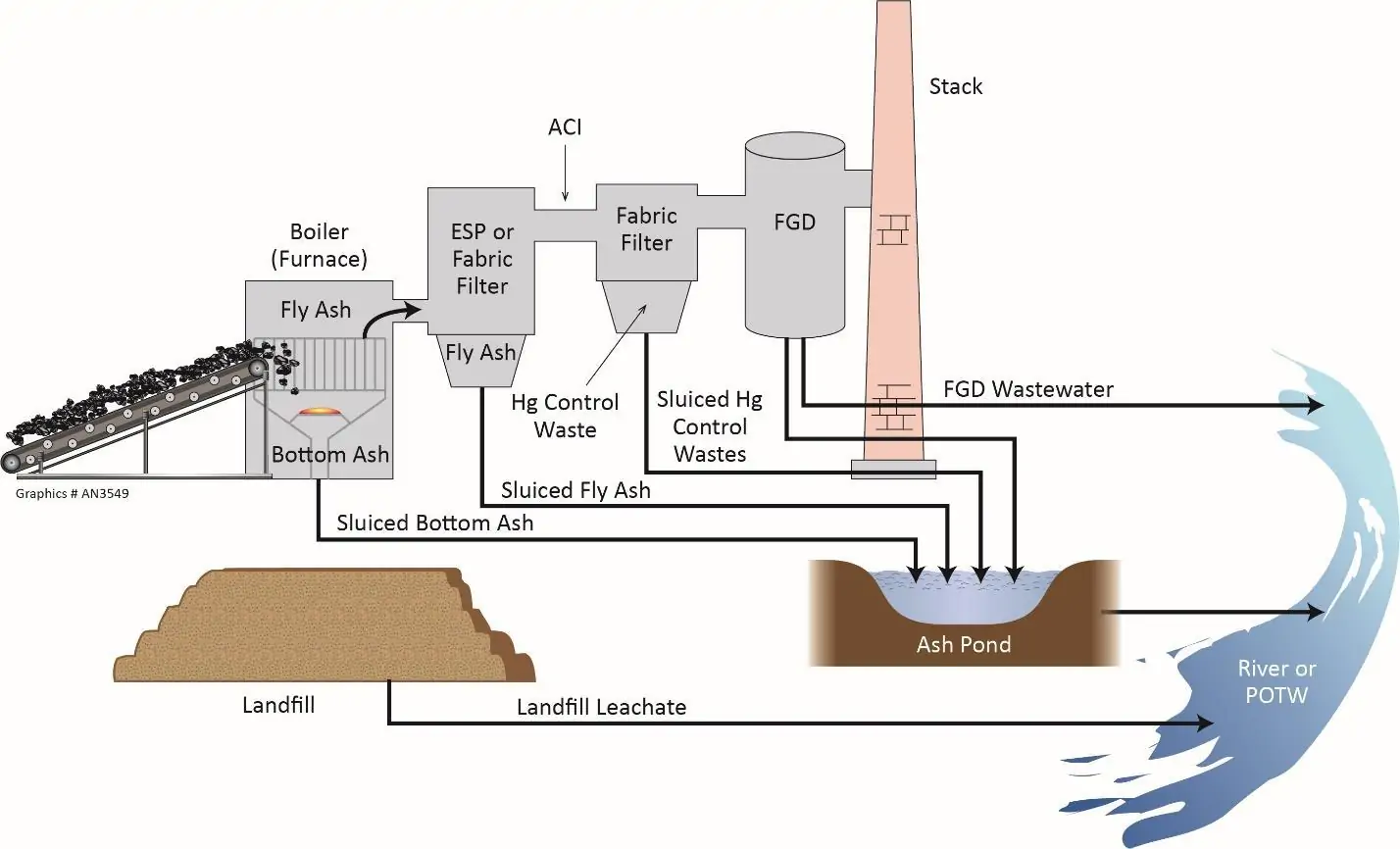 In addition to air emissions discharge, harmful impurities can also exit coal plants in a variety of aqueous pathways, as the figure below illustrates.