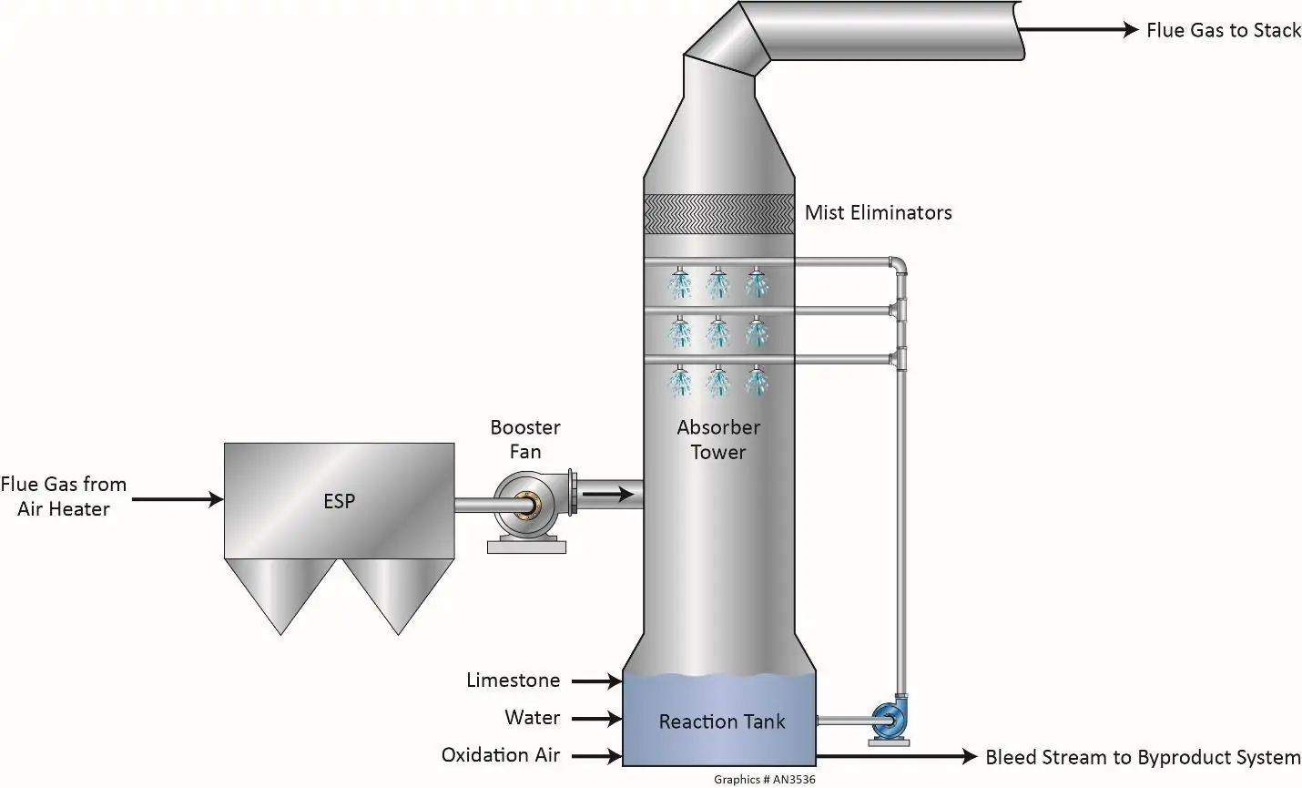 Initially, the most popular method was wet-limestone scrubbing. A generic flow diagram of a spray-type, wet-limestone scrubber is provided below.