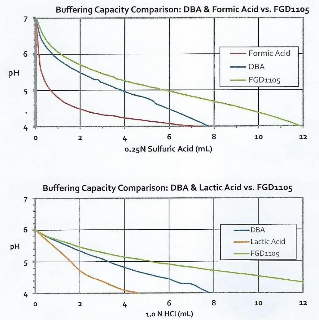 The product has a noticeably higher buffering capacity than DBA when titrated with both sulfuric and hydrochloric acids, and a much higher capacity than the other major alternatives, formic and lactic acids. Buffering capacity is a critical property of these products.