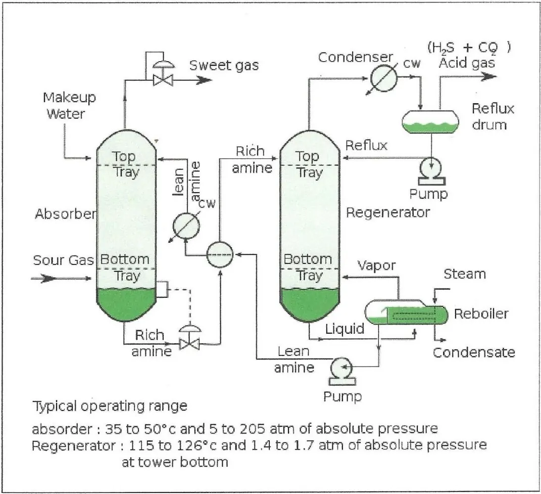 Lean amine supplemented with makeup water enters the top of the reactor vessel (on the left side of the diagram) and removes the acid gas. The rich amine solution is then introduced to the regenerator to release H2S and CO2 and recover the amine for reuse.